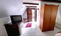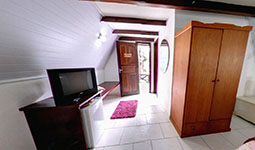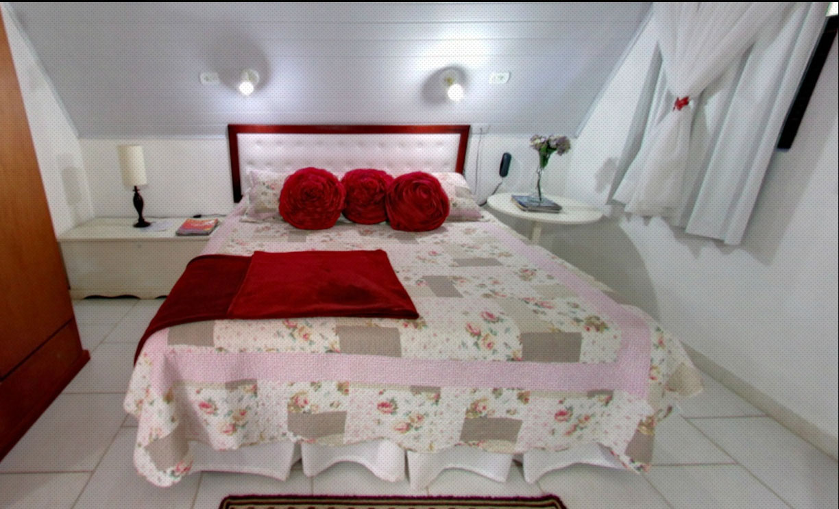Cama Box Queen, ar condicionado, Telefone, Televisão, Frigobar e Lareira. Confira abaixo algumas fotos do Chalé 3: