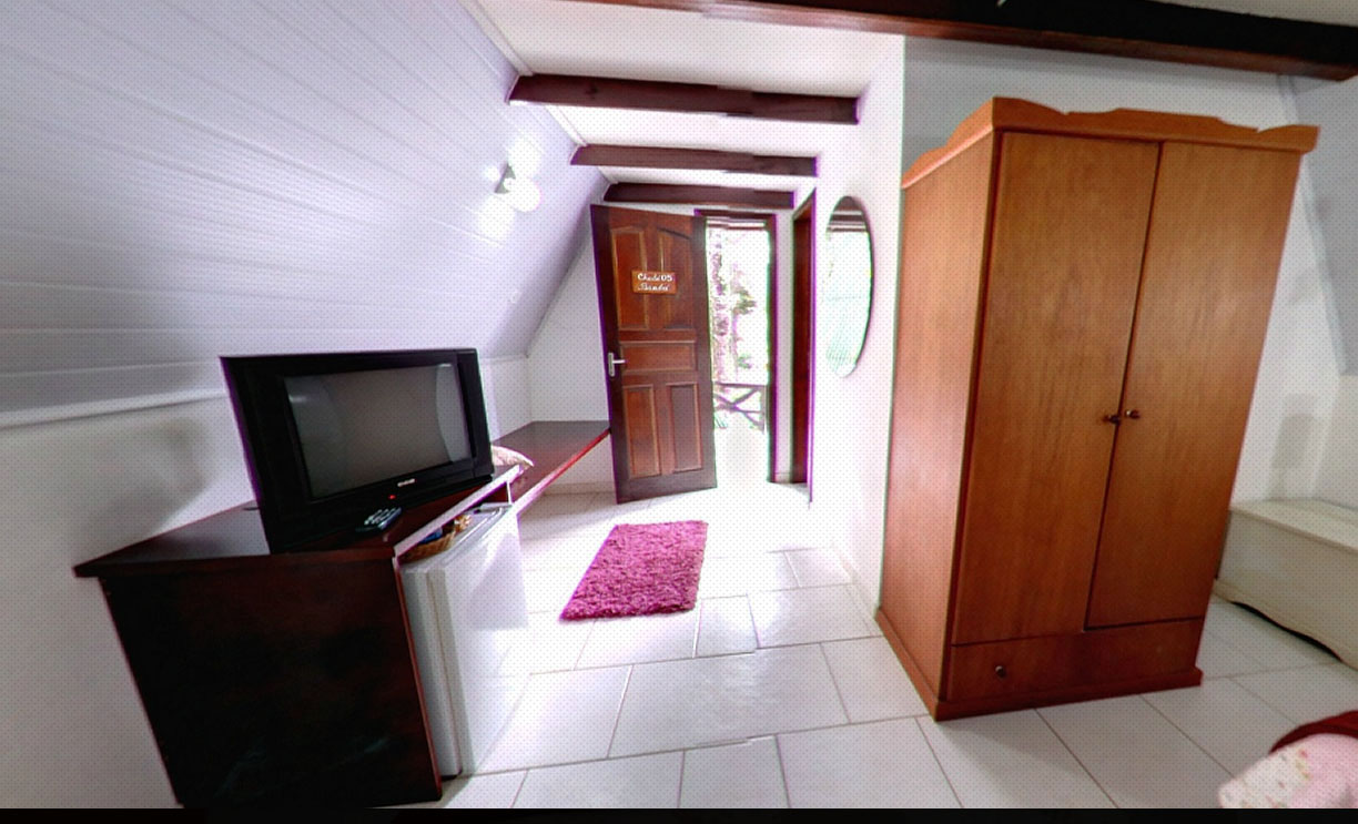 Cama Box Queen, ar condicionado, Telefone, Televisão, Frigobar e Lareira. Confira abaixo algumas fotos do Chalé 2: